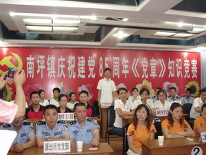 2006年6月12日下午,為慶祝中國(guó)共產(chǎn)黨建黨85周年,重慶市南岸區(qū)南坪鎮(zhèn)黨委開(kāi)展了《黨章》知識(shí)競(jìng)賽。我公司黨委選派周隼、趙偉、劉伶伶三位同志參加了比賽,經(jīng)過(guò)激烈的必答題、搶答題和風(fēng)險(xiǎn)題3輪競(jìng)爭(zhēng),最后取得了二等獎(jiǎng)。